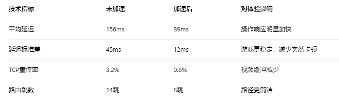 IP加速器主要改善的是延迟、抖动和丢包率,而非带宽。这对实时应用(游戏、视频通话)至关重要,但对大文件下载帮助有限。